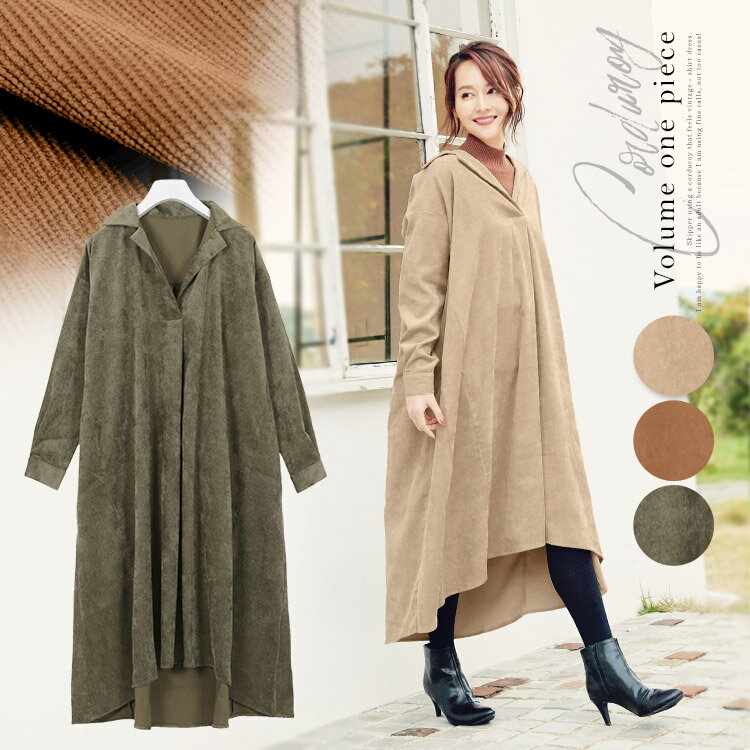 コーデュロイスキッパーボリュームロングワンピース レディース トップス ワンピース シャツワンピ ロング丈 秋冬 大人可愛い きれいめ 長袖 ロングワンピース シャツワンピース コーデュロイ スキッパー カーキ ベージュ [E1949]【入荷済】